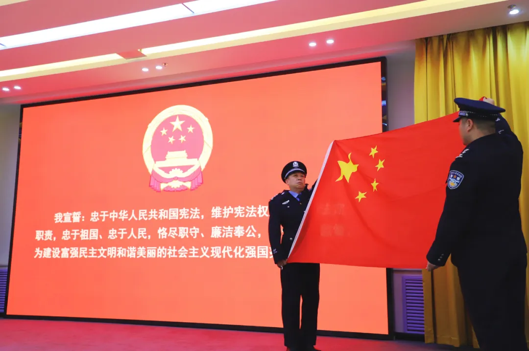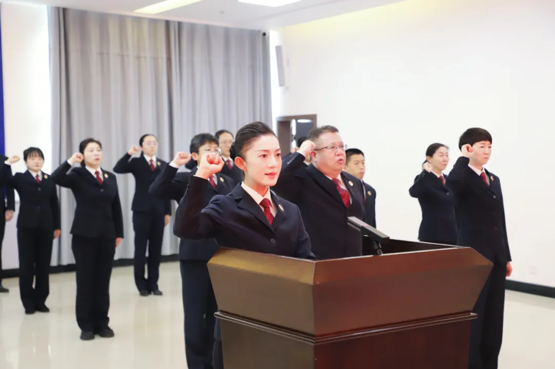 伴随着雄壮激昂的国歌,宣誓仪式拉开帷幕。全体检察人员身着检察制服、列队整齐,面向鲜艳的五星红旗昂首肃立。王俊琳检察长站在队伍前方,右手握拳高举,领诵宪法誓词,身后的检察干警齐声跟诵,雄浑有力,铿锵顿挫,每一句都饱含赤诚,充分展现了检察人员对宪法的尊崇、对法治的信仰以及践行检察使命的决心。